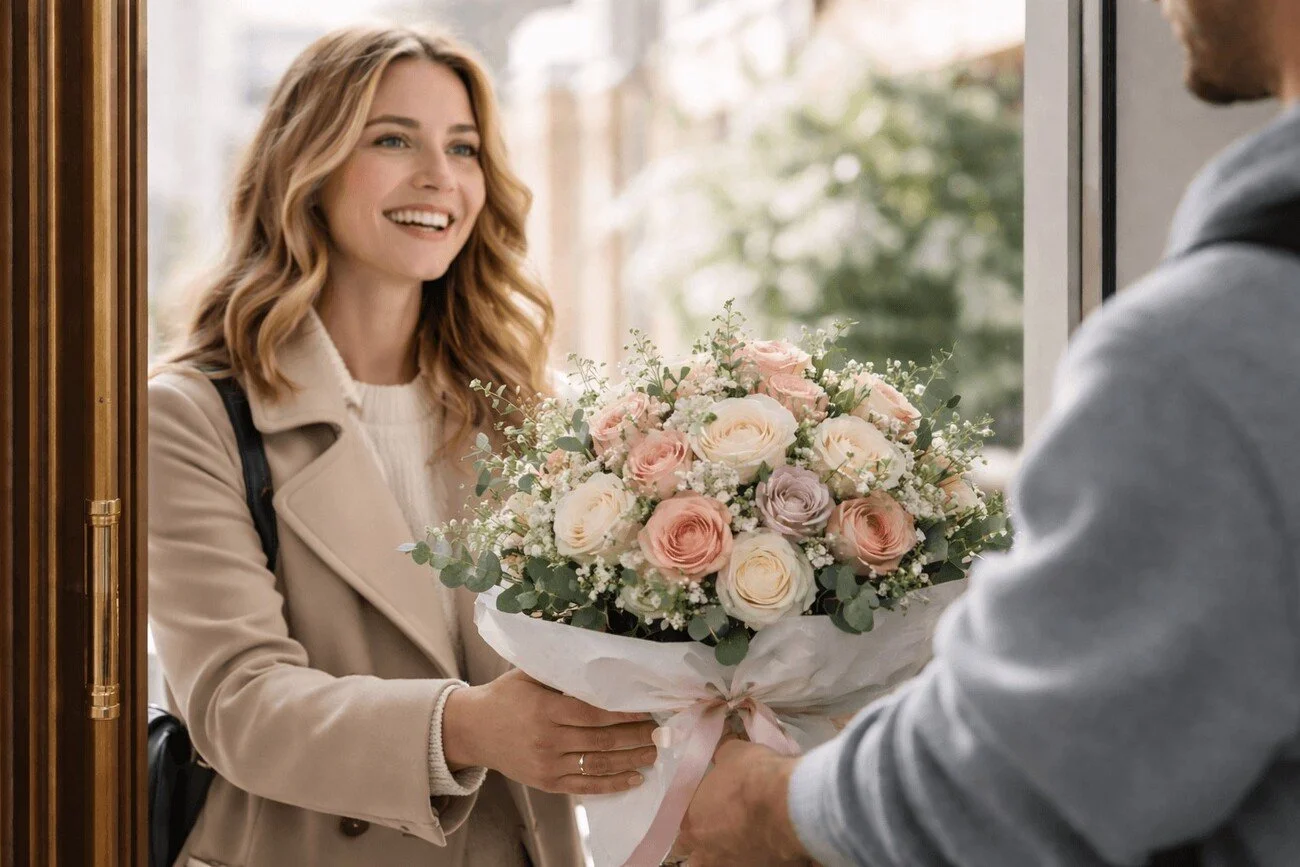 Alla buketter skapas för hand av erfarna florister med omsorg i varje detalj.